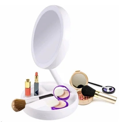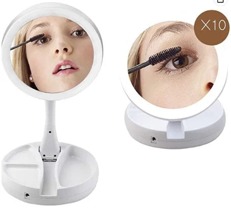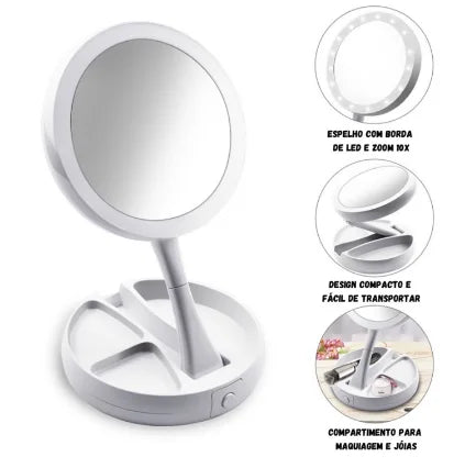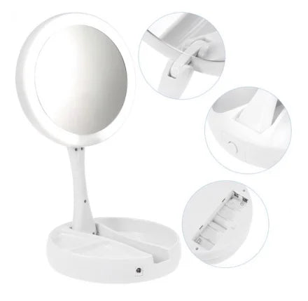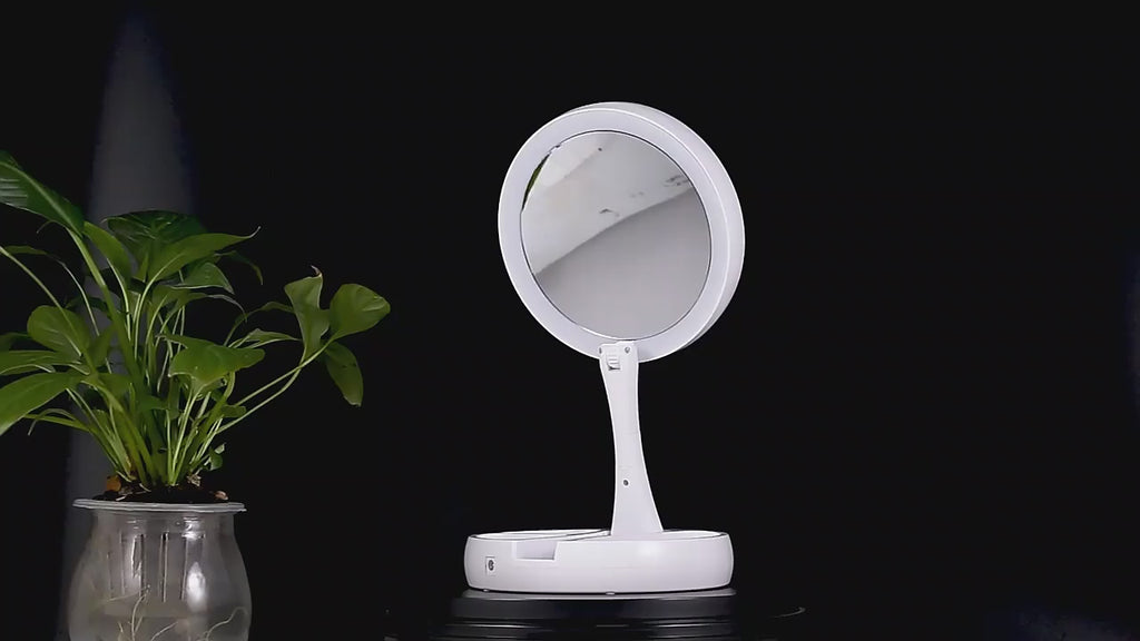 O espelho dobrável é um espelho que pode ser dobrado rapidamente e usado em qualquer cômodo da casa. Ele fica apoiado em seu próprio suporte e também gira e gira. Este espelho é dupla face, com um lado dando a você uma visão realista do seu rosto enquanto o outro lado o mostra 10 vezes maior. Além disso, pressionando um botão na parte inferior do suporte, você pode ligar as luzes LED que iluminarão ambos os lados. Quando terminar, meu espelho dobrável se dobrará de volta para a base para fácil armazenamento e transporte. Quando o espelho estiver estendido, há compartimentos onde você pode guardar pequenos acessórios, como elásticos ou presilhas de cabelo. Este é um espelho que pode ser dobrado rapidamente e usado em qualquer cômodo da casa. Ele fica apoiado em seu próprio suporte e também gira e gira. Este espelho é dupla face, com um lado dando a você uma visão realista do seu rosto enquanto o outro lado o mostra 10 vezes maior. Além disso, pressionando um botão na parte inferior do suporte, você pode ligar as luzes LED que iluminarão ambos os lados. Ao terminar, ele se dobra de volta para a base para facilitar o armazenamento e o transporte. Quando o espelho é estendido, há compartimentos onde você pode guardar pequenos acessórios, como elásticos ou presilhas de cabelo.